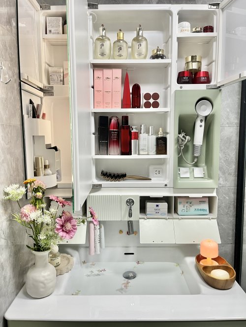 四季沐歌这款在实测中属于性价比取向。整体是偏温和的奶油色,风格比较大众化。镜柜设计有高低美妆镜和开放式侧柜,取放方便;镜背也预留了小物件收纳区,基础功能齐全。