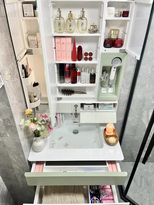 不过,它的设计并没有太多创新,没有动线规划,而且顶部电源线外露,追求完美细节的朋友会觉得有点膈应。此外,没有内置插座,缺少对吹风机和小物件的收纳空间。如果对收纳功能和外观要求不算特别高,这款浴室柜可以选。